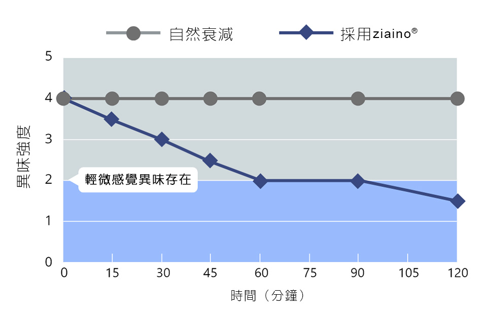 [測試實驗室]環境管理中心株式會社[測試條件]透過異味強度計算方法驗證 [測試物質]漂浮在空氣中的混合異味 [測試結果]於9.7m2的測試空間內,約120分鐘後異味強度降至1.5 [報告編號] H07019001DA